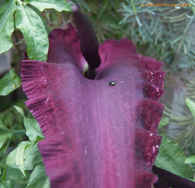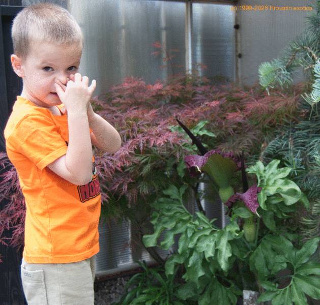 Koreninski gomolj smo posadili v globok lonec z zmerno humusnim substratom, katerega smo spomladi postavili na zunanji prostor ob plastičnjaku. Spomladi zelo hitro zrastejo veliki razvejani dekorativni zeleni listi. Iz njihove sredine požene zeleni poganjek, ki se kasneje razvije v temnovijoličasti cvet z črnim nastavkom v sredini, imenovanim spadiks. Cvet en dan močno smrdi po gnilem mesu in privablja opraševalce, v našem okolju ponavadi velike mesarske muhe.