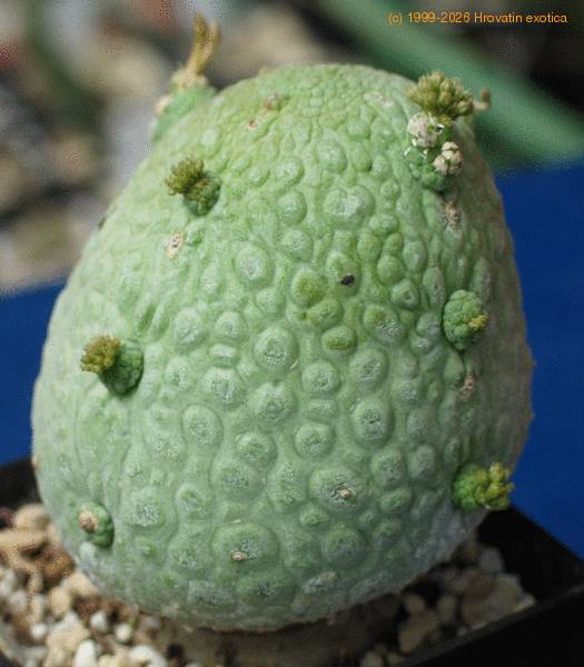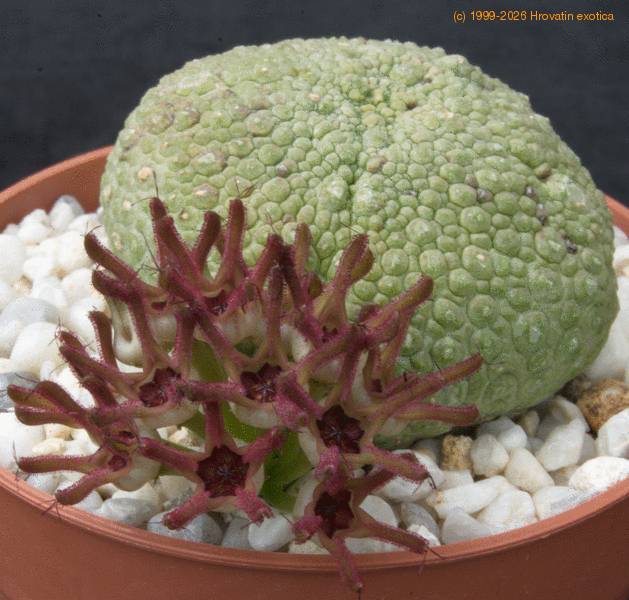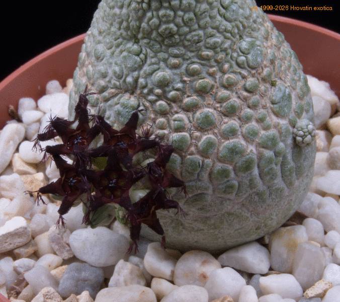 Raritetna rastlina, nekaj posebnega v vsaki bogatejši zbirki sukulent. Telo je okroglo-valjaste oblike, posuto z drobnimi bradavicami, sivo zelene barve in smrdljivimi cvetovi. Potrebuje porozen substrat z malo humusa, skozi katerega voda pri zalivanju hitro odteče. V rastni sezoni naj bo v toplem prostoru, zaščitenem pred direktnim soncem. Zalivamo na 14 dni z deževnico ali postano vodo segreto na temperaturo okolja. Pri nas zimsko obdobje preživijo v stekleniku pri temperaturi okoli 14-16 stopinj C. V tem obdobju petih mesecev jih ne zalivamo. Če jih prezimite na okenski polici in pri sobni temepraturi 20 – 22 st. C. potrebujejo vsak mesec malo tople vode v podstavek, tako da se koreninice popolnoma ne izsušijo. Zlasti moramo biti pazljivi v poznih spomladanskih mesecih, ko začnemo z postopnim zalivanjem. Obilo vlage po dolgih mesecih sušnega obdobja, ne glede na toploto, lahko povzroči hitro gnitje korenin. Vlažne korenine v mokrem substratu ne prenesejo dalj časa nižje temperature pod 18 stopinj C. saj so izredno občutljive na gnilobo. Proces gnitja je neopazen, toda ko se začne, ni več rešitve. To rariteto lahko z uspehom gojiš nekaj let, toda najmanjša nepazljivost je lahko usodna, kot se vidi na zadnji sliki. Rastlino je napadla glivična bolezen in ji ni pomoči. Vzroke je težko ugotoviti, lahko pa so naslednji: malo preveč vode, prenizka zimska temperatura, prevelik del humusa v substratu.